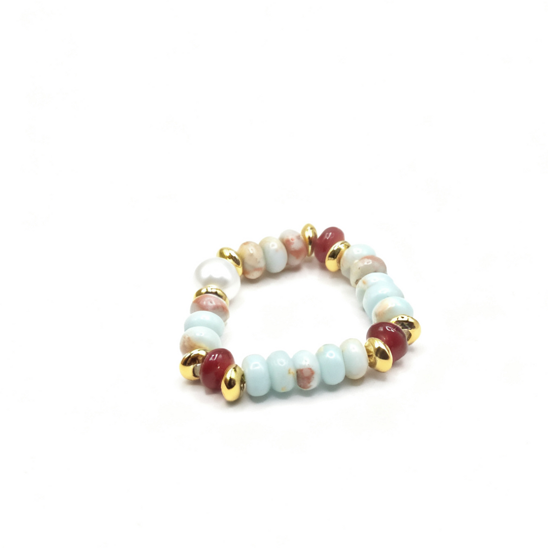 "Île Bleue" Bague élastique - pierre de Shoushan, agate rouge et perle d'eau douce
