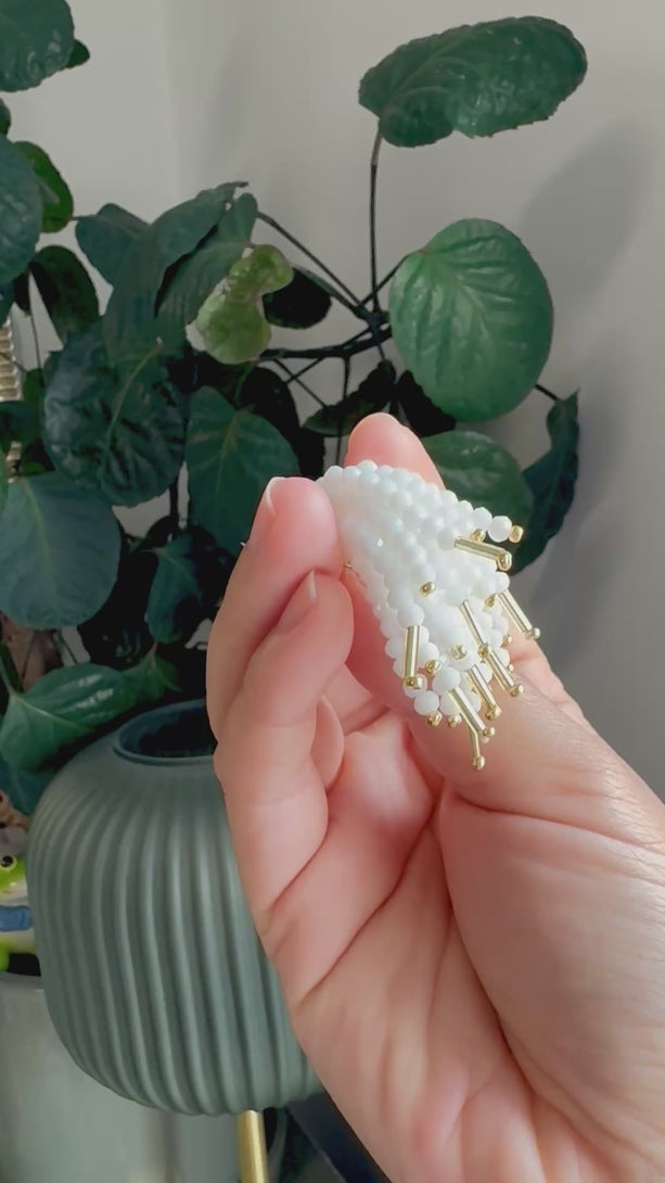 Boucles d'oreilles artisanales à franges perles blanches et dorées --White Dreams